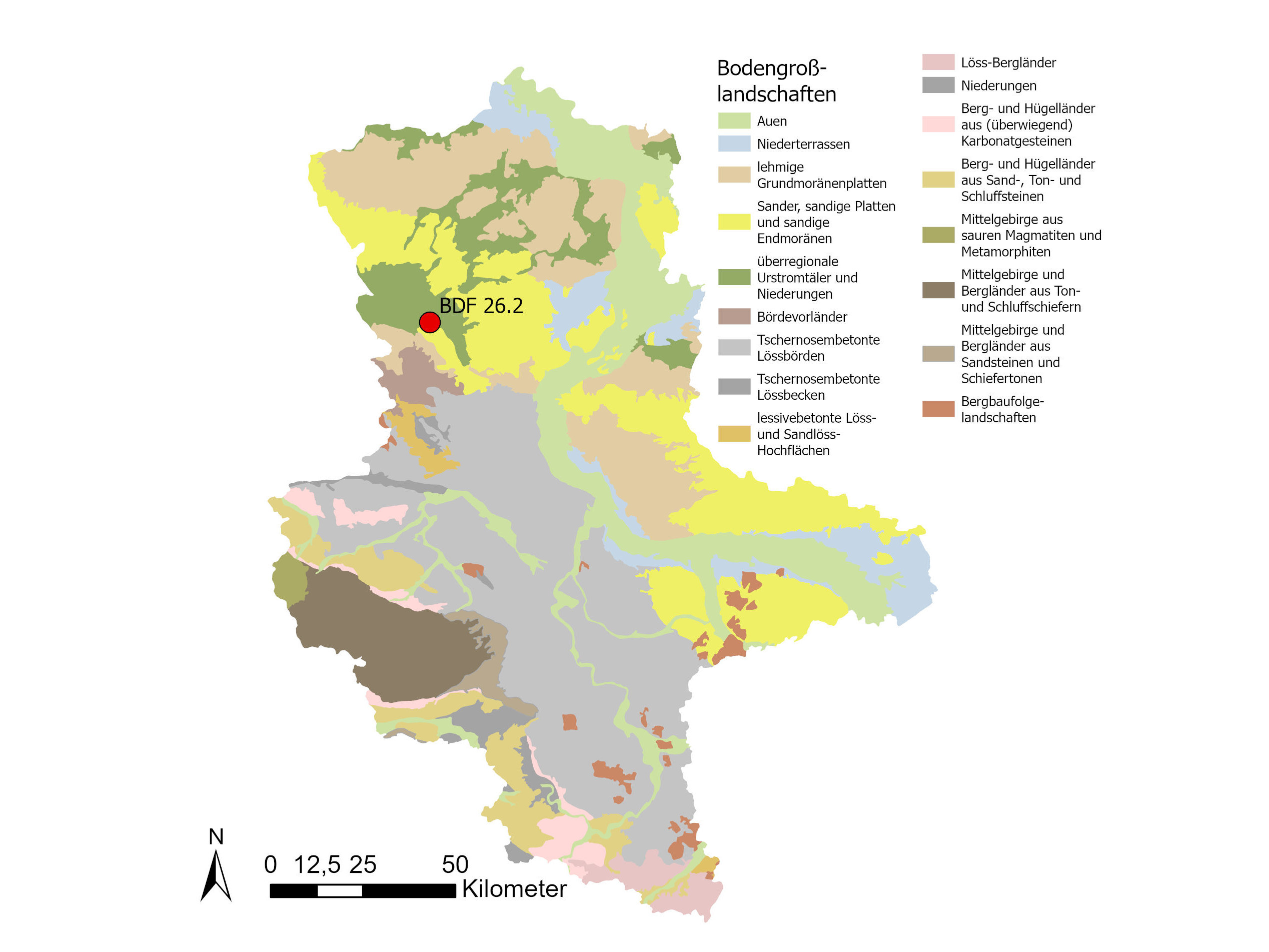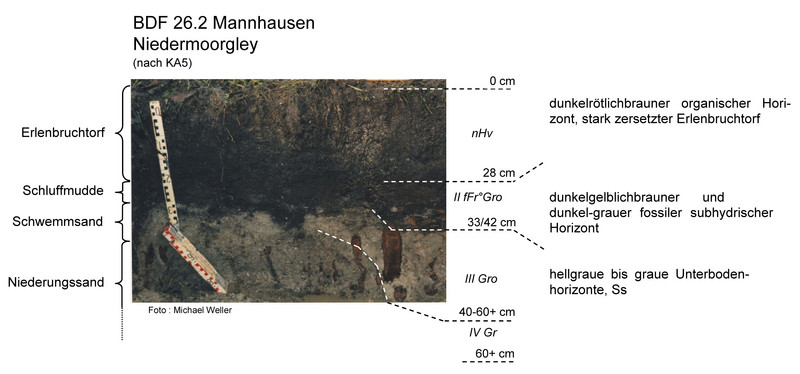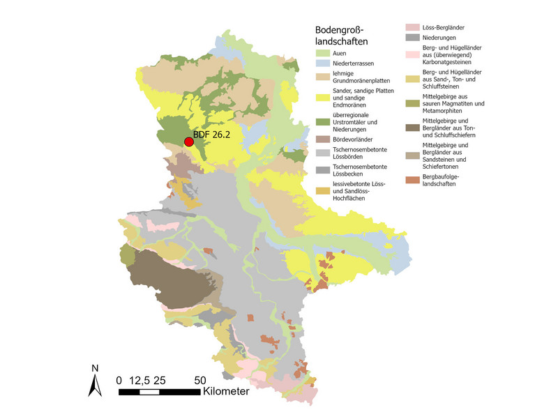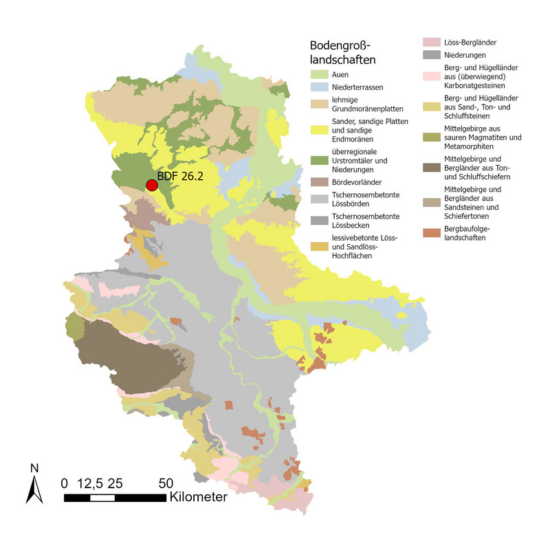 Bei der BDF 26.2 handelt es sich um einen Niedermoorgley aus flachem Torf über Mudde. Der Torf weist einen hohen Zersetzungsgrad auf, da dieser durch niedrige Wasserstände bereits stark vererdet ist. Im Bereich des Oberbodens ist die Trockenrohdichte sehr gering (0,5 Vol.-%), das Gesamtporenvolumen sehr hoch (76 Vol.-%) und die nutzbare Feldkapazität ebenfalls im sehr hohen Bereich (45 bis 48 Vol.-%).
