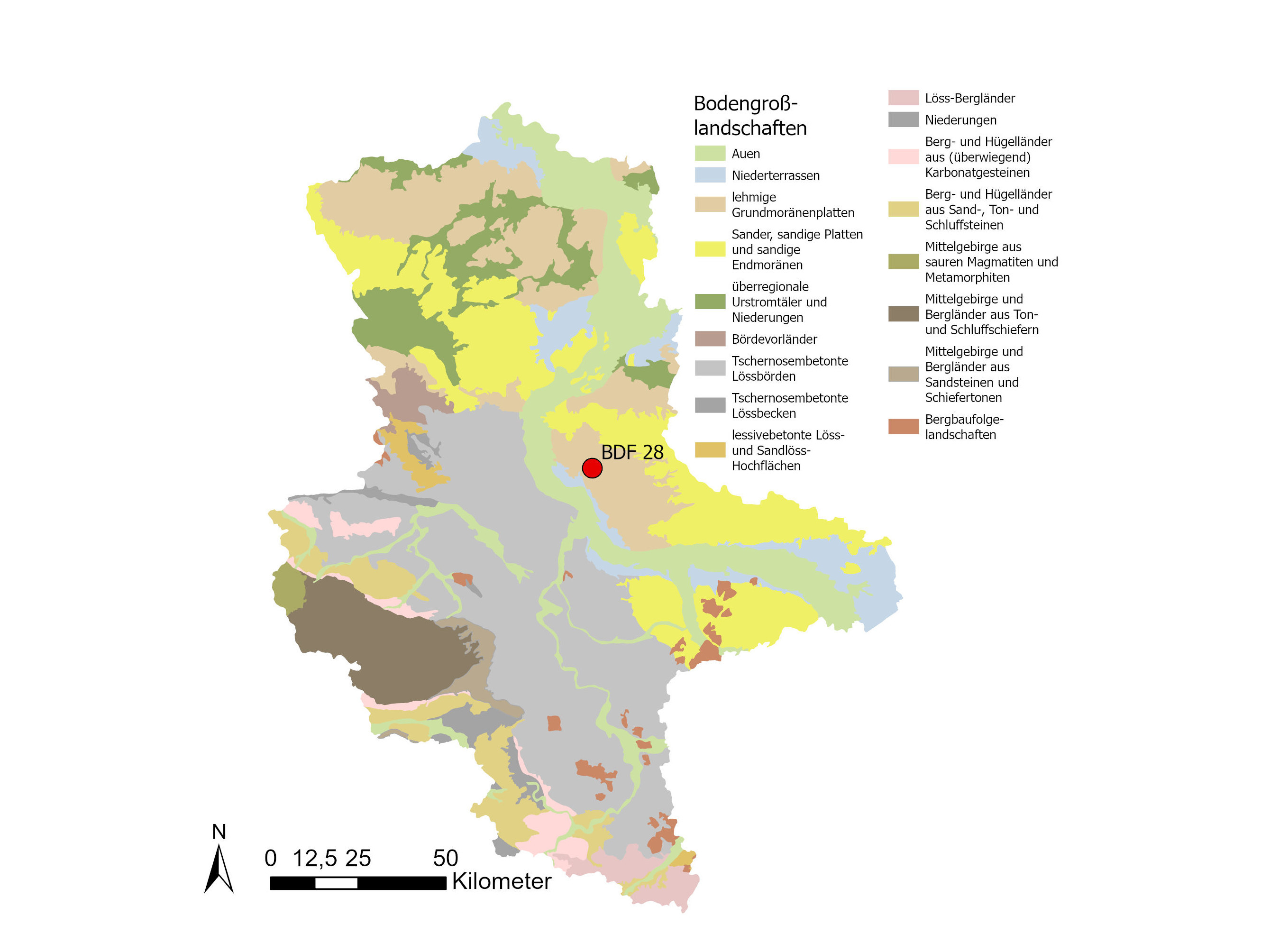 Bei der BDF 28 handelt es sich um einen Pseudogley-Tschernosem aus umgelagertem Lehm. Der Standort ist als Ackerstandort gut geeignet, auf Grund der hohen Nährstoffverfügbarkeit, jedoch kann zeitweise Staunässe die Bodenbearbeitung erschweren. Im Oberboden ist die Trockenrohdichte im mittleren Bereich (1,6 Vol.-%), das Gesamtporenvolumen gering bis mittel (38 Vol.-%) und die nutzbare Feldkapazität im geringen Bereich (8 bis 10 Vol.-%).