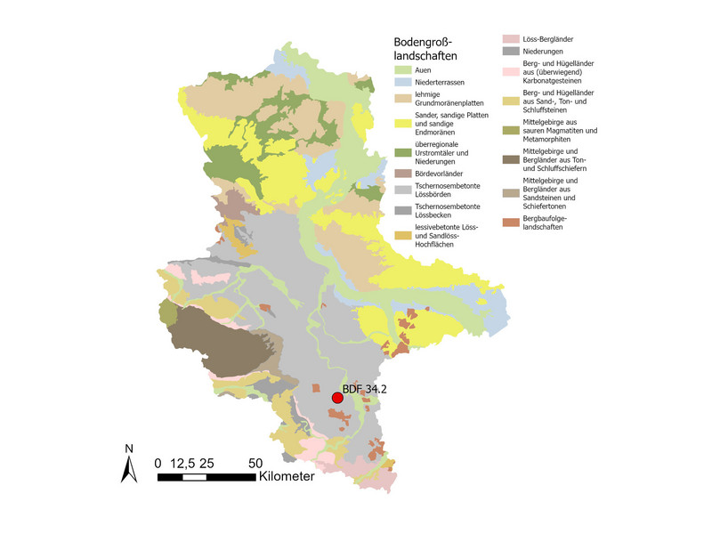 Bei der BDF 34.2 handelt es sich um einen stark pseudovergleyten Normtschernosem aus Löss. Grundlegend handelt es sich um einen ertragreichen Ackerstandort, jedoch kann eine zeitweise Staunässe die Bearbeitbarkeit und Durchwurzelbarkeit einschränken. Im Bereich des Oberbodens ist die Trockenrohdichte im mittleren Bereich (1,5 Vol.-%), das Gesamtporenvolumen mittel (42 Vol.-%) und die nutzbare Feldkapazität im mittleren Bereich (17 bis 21 Vol.-%).