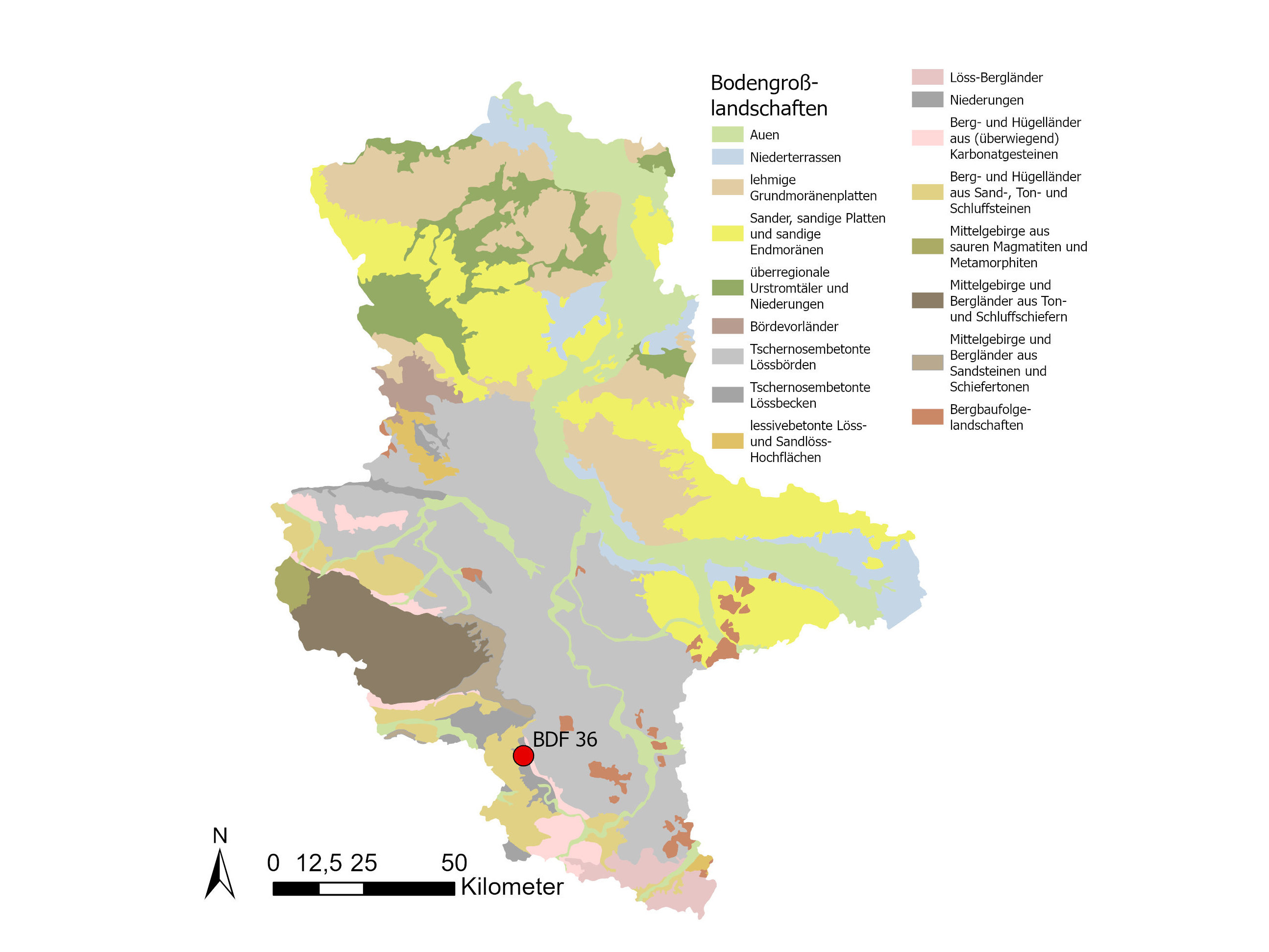Bei der BDF 36 handelt es sich um eine schwach pseudovergleyte Normpararendzina aus flachem Löss. Dieser Standort ist mäßig bis gut geeignet für den Ackerbau und weist eine gute Nährstoffverfügbarkeit auf. Im Oberboden sind die Trockenrohdichte (1,6 Vol.-%), das Gesamtporenvolumen (39 Vol.-%) und die nutzbare Feldkapazität im mittleren Bereich (19 bis 22 Vol.-%).
