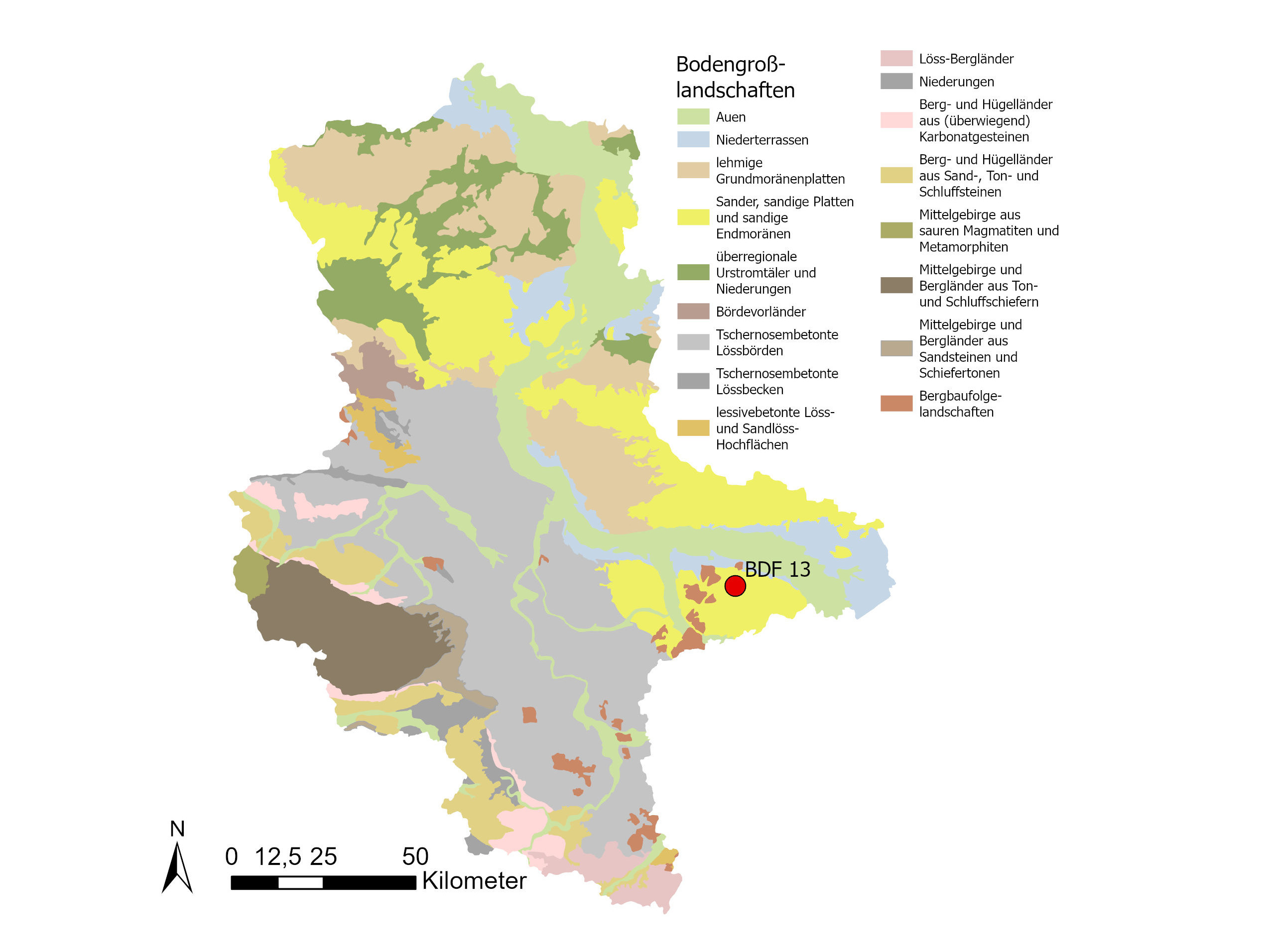 Der Boden der BDF 13 ist ein Braunerde-Pseudogley aus kiesführendem Geschiebedecksand über Lehm-Fließerde über tiefer Ton-Fließerde. Die Nährstoffversorgung im Oberboden ist gut, kann aber durch zeitweise Staunässe behindert werden. Im Bereich des Oberbodens ist die Trockenrohdichte sehr gering bis gering (0,85 bis 1,4 Vol.-%), das Gesamtporenvolumen hoch bis sehr hoch (44 bis 66 Vol.-%) und die nutzbare Feldkapazität mittel bis hoch (18 bis 30 Vol.-%).