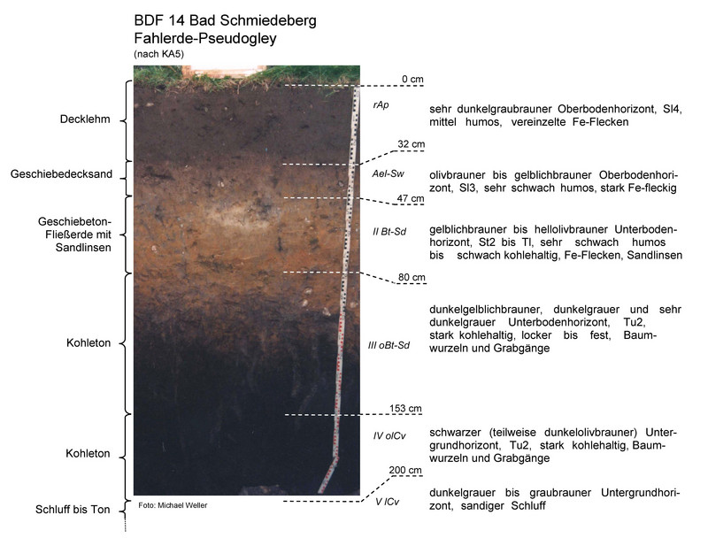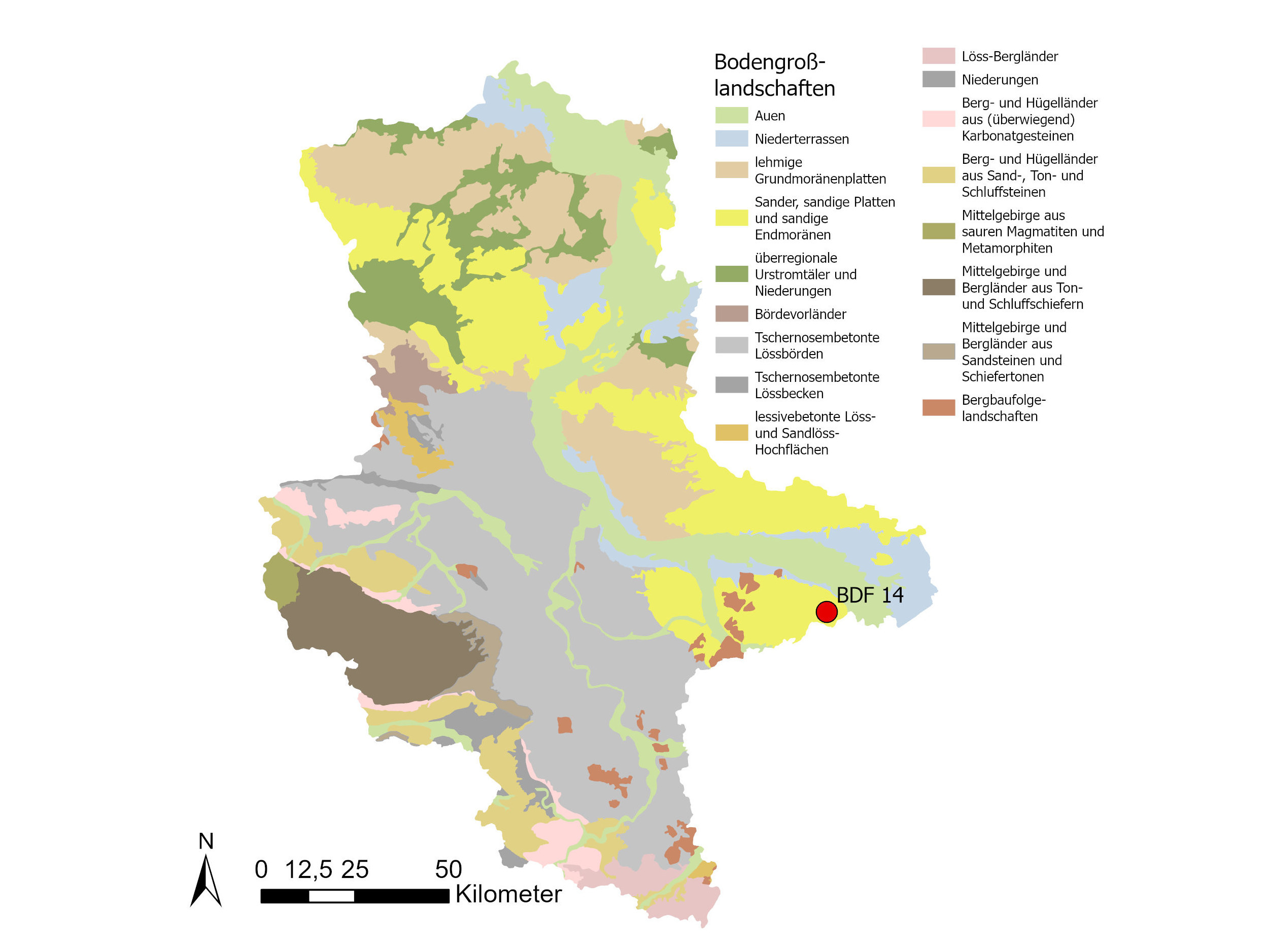Der Boden unter der BDF 14 ist ein Fahlerde-Pseudogley aus Decklehm und Geschiebedecksand über Geschiebeton. Es besteht zeitweise Staunässegefahr, was Auswirkungen auf die Durchwurzelbarkeit und somit das Pflanzenwachstung hat. Im Bereich des Oberbodens ist die Trockenrohdichte im mittleren bis hohen Bereich (1,6 Vol.-%), das Gesamtporenvolumen ist gering (38 Vol.-%) und die nutzbare Feldkapazität im mittleren Bereich (15 bis 18 Vol.-%).