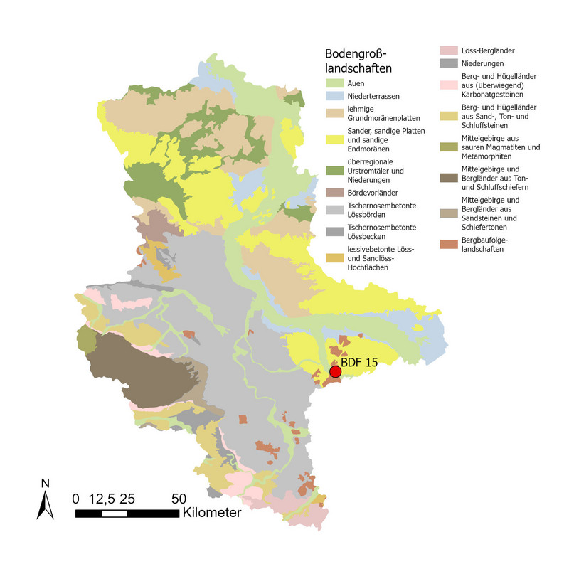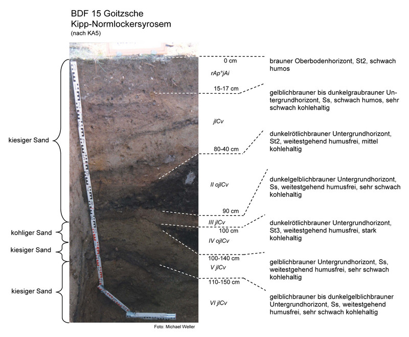Der Boden der BDF 15 ist ein Kipp-Normlockersyrosem aus kiesführendem Kipp-Sand mit Beimengungen von Ton und Kohlesand. Dieser junge Boden ist auf künstlich aufgeschüttetem Abraummaterial aus dem Braunkohletagebau entstanden. Im Bereich des Oberbodens ist die Trockenrohdichte im hohen Bereich (1,7 Vol.-%), das Gesamtporenvolumen ist gering (34 bis 37 Vol.-%) und die nutzbare Feldkapazität sehr gering (3 bis 4 Vol.-%).
