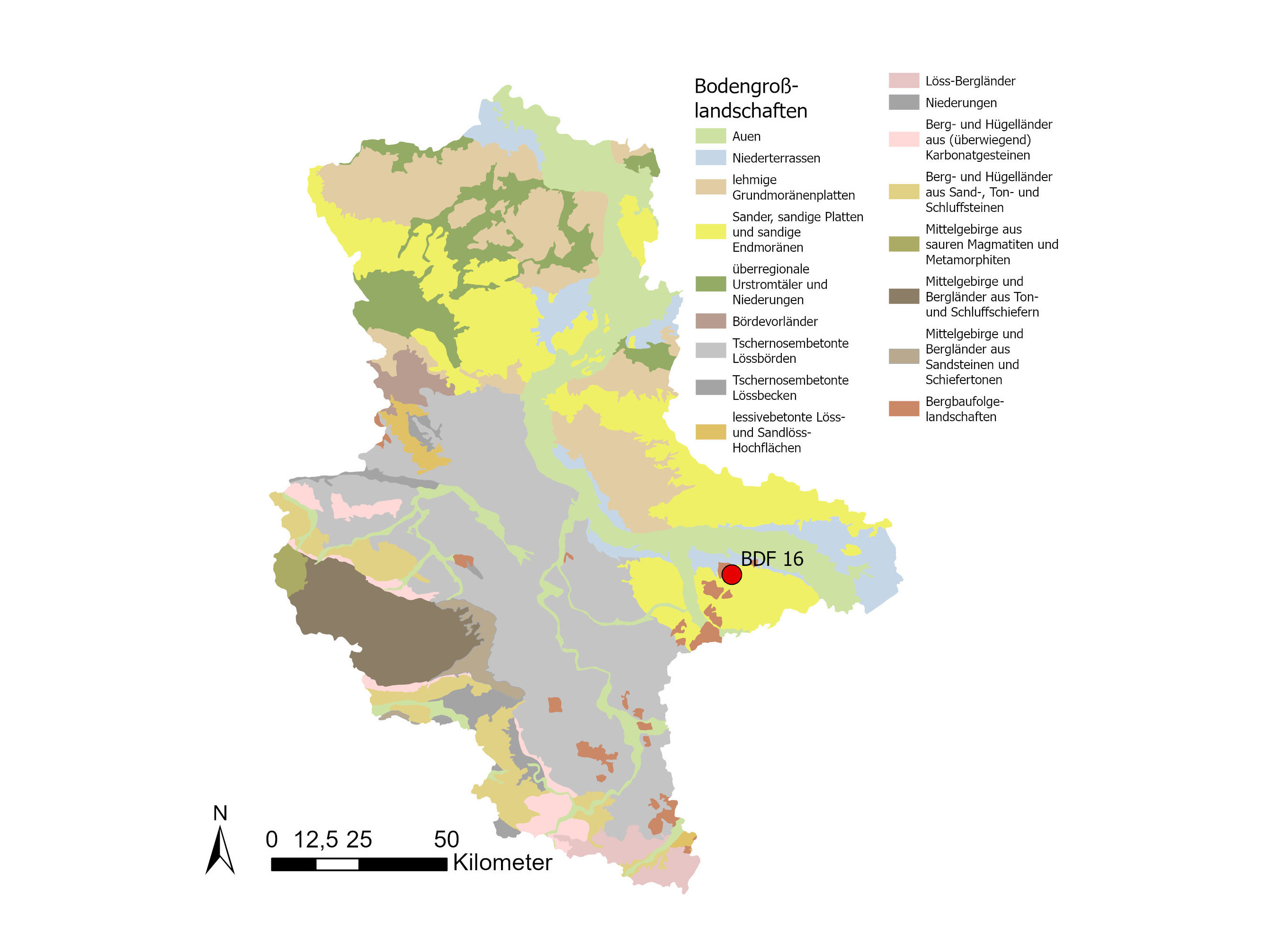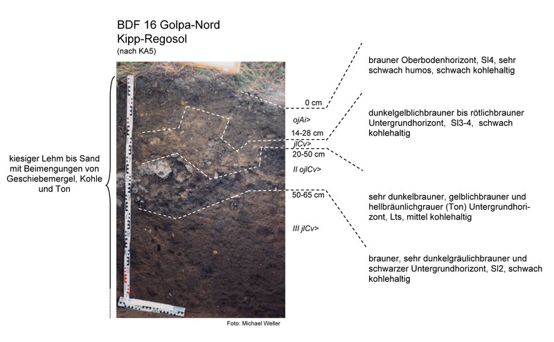 Der Boden der BDF 16 ist ein Kipp-Regosol aus kiesführendem Kipp-Lehm mit Beimengungen von Ton, Kohle und Kalklehm. Grundlage dieses Bergbaufolgebodens bildet das locker umgelagerte Kippenmaterial aus dem Braunkohletagebau. Im Bereich des Oberbodens ist die Trockenrohdichte im mittleren bis hohen Bereich (1,4 bis 1,7 Vol.-%), das Gesamtporenvolumen ist gering bis mittel (34 bis 46 Vol.-%) und die nutzbare Feldkapazität gering (7 bis 14 Vol.-%).
