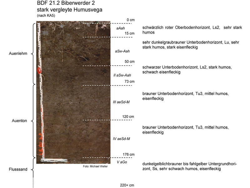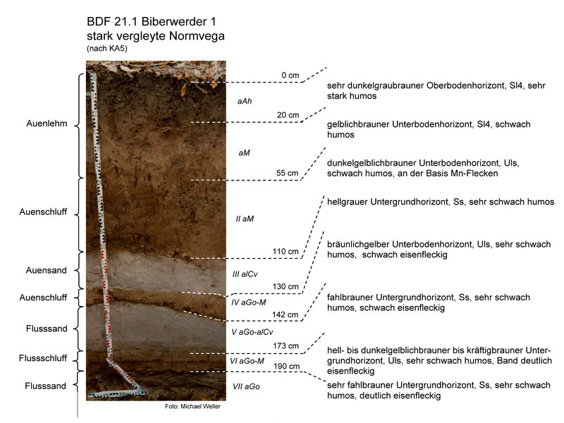 Bei der Fläche Biberwerder 1 handelt es sich um eine stark vergleyte Normvega aus Auenlehm und Biberwerder 2 ist eine stark vergleyte kalkhaltige Humusvega aus Auenlehm. Biberwerder 1 wird bei mittleren Hochwässern überflutet und ist mit einem Eichen-Ulmen-Hartholzauenwald bestockt. Die Trockenrohdichte im Bereich des Oberbodens ist sehr gering (0,9 Vol.-%), das Gesamtporenvolumen sehr hoch (58 Vol.-%) und die nutzbaren Feldkapazität gering (2 bis 5 Vol.-%). Die Fläche Biberwerder 2 liegt etwas niedriger in einer Flutrinne und ist somit bei geringeren Wasserständen bereits überflutet. Die Fläche ist mit Stieleiche bestockt und weist im Bereich des Oberbodens eine noch geringere Trockenrohdichte auf (0,7 Vol.-%), das Gesamtporenvolumen ist ebenfalls sehr hoch (70 Vol.-%) und die nutzbaren Feldkapazität ist im Vergleich zu Biberwerder 1 hoch (22-24 Vol.-%).