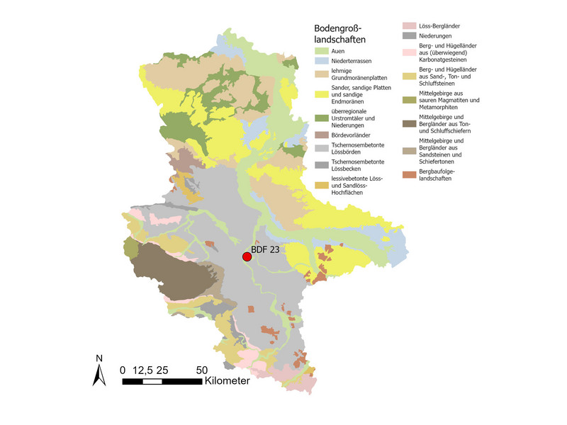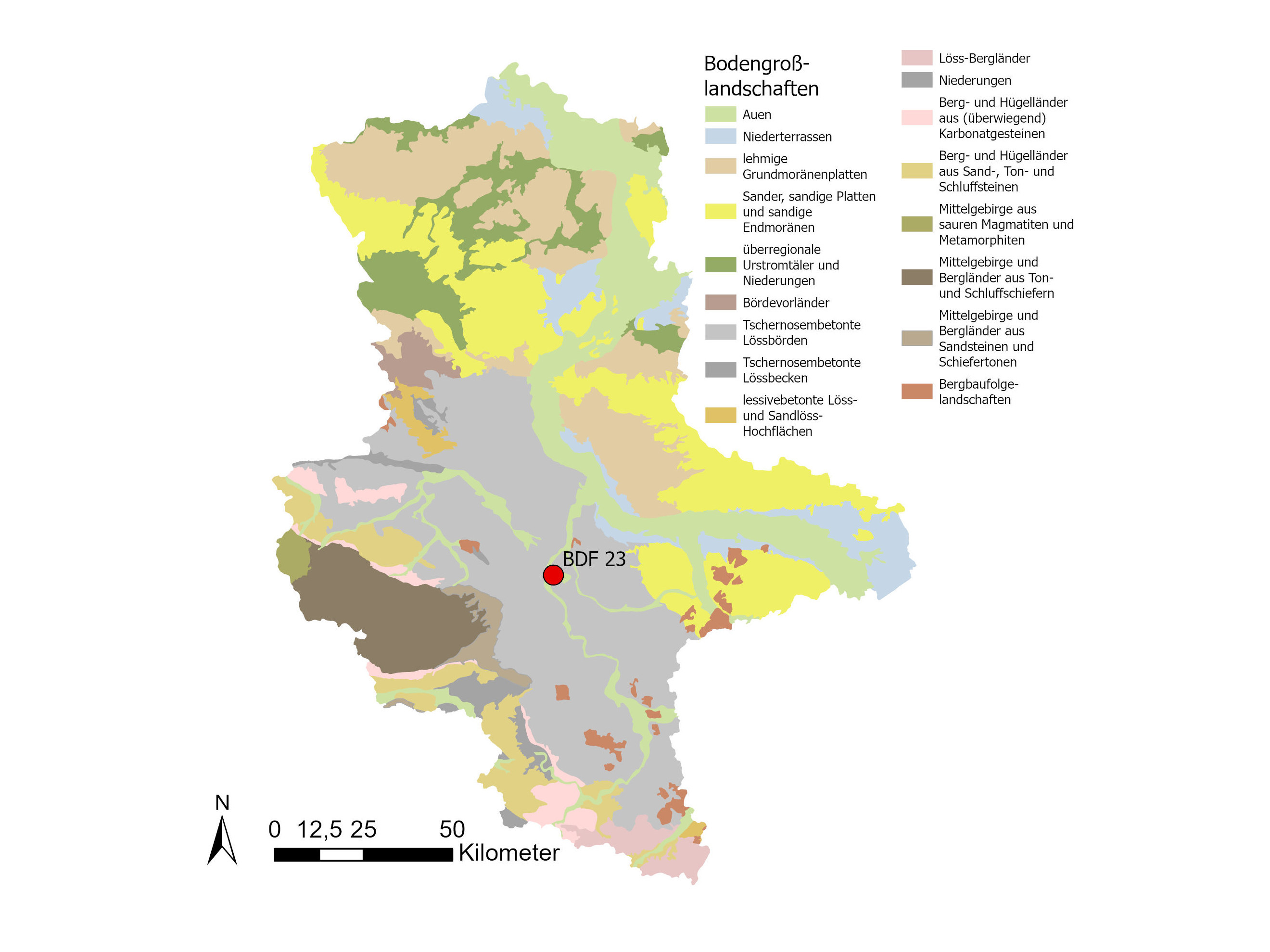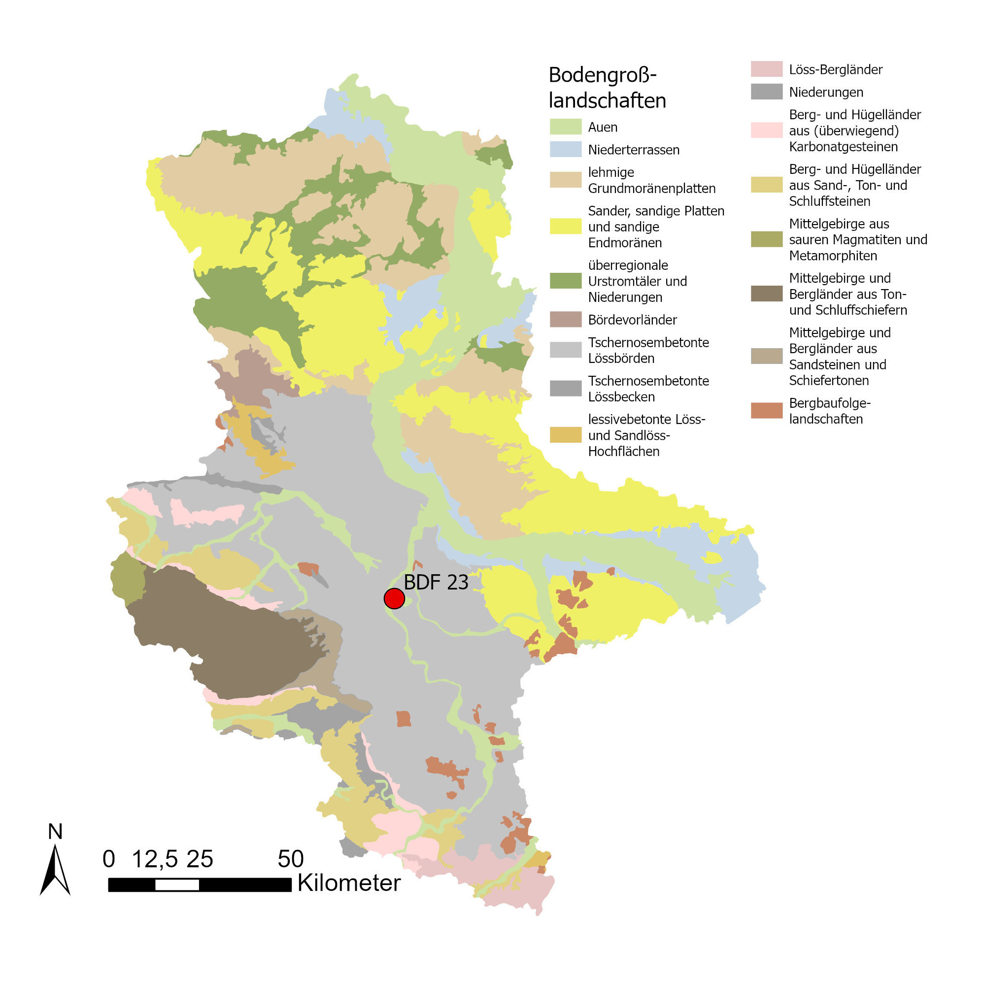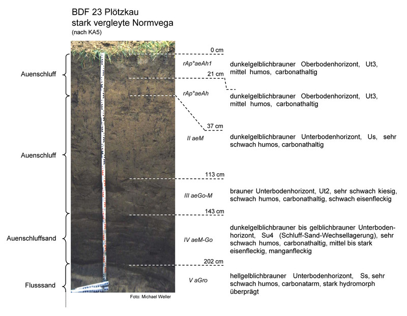 Der Boden der BDF 23 ist eine stark vergleyte, kalkhaltige Normvega aus Auenschluff. Die ackerbauliche Nutzung dieses nährstoffreichen Standorts ist gut möglich, jedoch sollte eine an den Wasserhaushalt angepasste Bewirtschaftung (s. Befahrung bei Nässe, Kulturauswahl) erfolgen. Im Bereich des Oberbodens ist die Trockenrohdichte mittel (1,5 Vol.-%), das Gesamtporenvolumen mittel (43 Vol.-%) und die nutzbare Feldkapazität als geringen einzuordnen (11 bis 15 Vol.-%).
