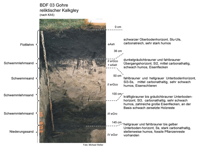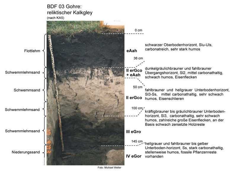 Es handelt sich um einen humusreichen reliktischen Kalkgley aus Flottlehm über Niederungssand. Gleyböden zeichnen sich durch den großen Einfluss des Grundwassers auf die bodenbildenden Prozesse aus. Im Profil sind charakteristische Oxidations- und Reduktionsmerkmale in Form von Rost- und Manganflecken sichtbar und die Bearbeitbarkeit ist zum Teil eingeschränkt. Im Bereich des Oberbodens ist die Trockenrohdichte sehr gering (0,94 Vol.-%), das Gesamtporenvolumen sehr hoch (62 Vol.-%) und die nutzbare Feldkapazität hoch (21 bis 26 Vol.-%).