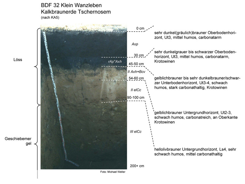 Der Boden unter der BDF 32 ist ein Kalkbraunerde-Tschernosem aus Löss. Es handelt sich um einen guten Ackerstandort mit einer hohen Ertragsfähigkeit, auf Grund einer guten Nährstoffverfügbarkeit, Wasserhaltefähigkeit und Durchwurzelbarkeit. Im Bereich des Oberbodens ist die Trockenrohdichte im geringen Bereich (1,36 Vol.-%), das Gesamtporenvolumen mittel (42 Vol.-%) und die nutzbare Feldkapazität im mittleren Bereich (14 bis 21 Vol.-%).