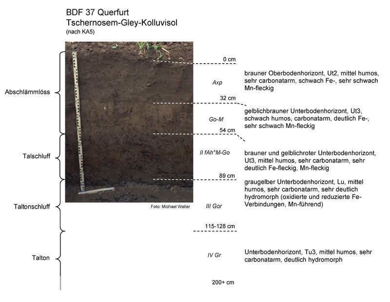 Bei der BDF 37 handelt es sich um einen Tschernosem-Gley-Kolluvisol aus Abschlämmlöss über Talschluff. Dieser Standort weist einen fruchtbaren, aber hinsichtlich der Bearbeitbarkeit (s. Nässe) anspruchsvollen Boden auf. Im Bereich des Oberbodens ist die Trockenrohdichte im geringen Bereich (1,25 Vol.-%), das Gesamtporenvolumen hoch (51 Vol.-%) und die nutzbare Feldkapazität im hohen Bereich (21 bis 27 Vol.-%).