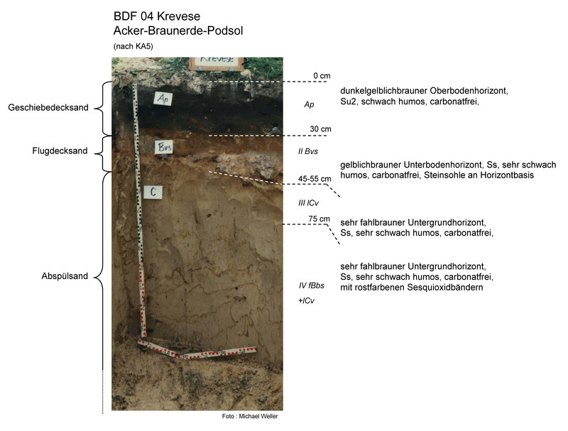 Es handelt sich um einen Acker-Braunerde-Podsol aus Geschiebe- und Flugdecksand über Abspülsand. Als Ackerstandort ist dieser Boden beschränkt geeignet, da die Podsolierung insbesondere im Oberboden für Nährstoffverarmung sorgt. Im Bereich des Oberbodens ist die Trockenrohdichte mittel bis hoch (1,6 Vol.-%), das Gesamtporenvolumen mittel (39 Vol.-%) und die nutzbare Feldkapazität gering (6 bis 14 Vol.-%).