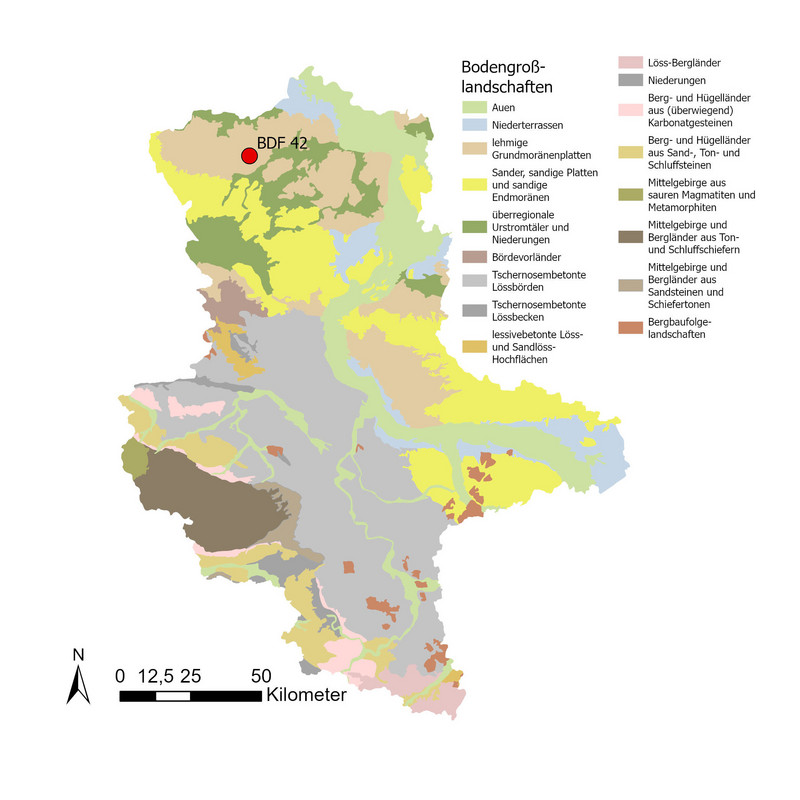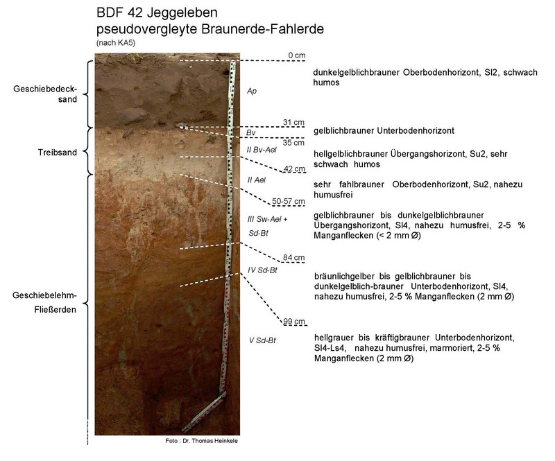 Der Boden unter der BDF 42 ist eine pseudovergleyte Braunerde-Fahlerde aus Geschiebedecksand über Treibsand. Es handelt sich nur bedingt um einen ertragsfähigen Ackerstandort, auf Grund der Staunässegefahr. Im Bereich des Oberbodens ist die Trockenrohdichte im mittleren Bereich (1,56 Vol.-%), das Gesamtporenvolumen mittel (40 Vol.-%) und die nutzbare Feldkapazität im geringen bis mittleren Bereich (12 bis 18 Vol.-%).