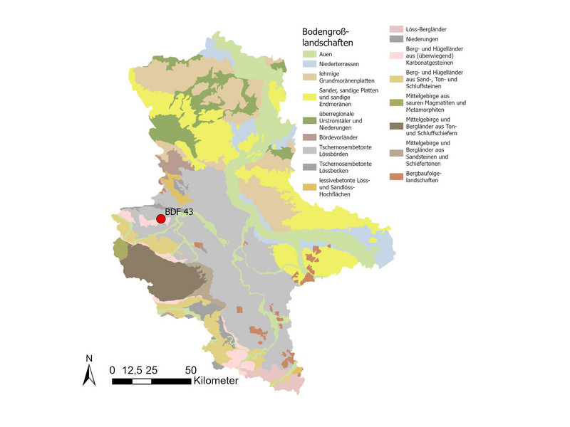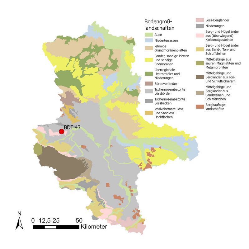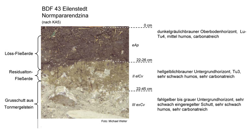 Der Boden unter der BDF 43 ist eine Normpararendzina aus flacher grusführender, carbonathaltiger Löss-Fließerde. Es handelt sich um einen ertragsfähigen Ackerstandort, jedoch besteht auf Grund der Bodeneigenschaften und Lage am Hang Erosionsgefahr. Im Bereich des Oberbodens ist die Trockenrohdichte im mittleren Bereich (1,57 Vol.-%), das Gesamtporenvolumen mittel (39 Vol.-%) und die nutzbare Feldkapazität im geringen Bereich (4 bis 7 Vol.-%).