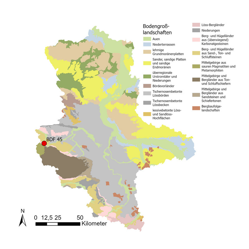 Der Boden unter der BDF 45 ist ein erodierter Braunerde-Fahlerde-Pseudogley aus Hangsandlöss-Fließerde über Terrassenlehmgrus. Es handelt sich um einen anspruchsvollen Ackerstandort hinsichtlich der Bearbeitung und Kulturwahl, auf Grund von Staunässe- und Erosionsgefahr. Im Bereich des Oberbodens ist die Trockenrohdichte im hohen Bereich (1,61 Vol.-%), das Gesamtporenvolumen gering bis mittel (38 Vol.-%) und die nutzbare Feldkapazität im mittleren Bereich (13 bis 14 Vol.-%).