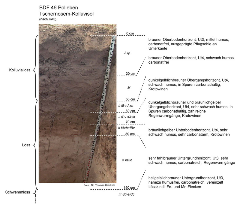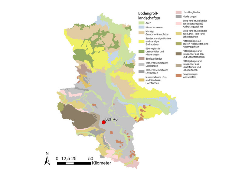 Der Boden unter der BDF 46 ist ein Tschernosem-Kolluvisol aus Löss. Es handelt sich um einen ertragreichen Ackerstandort, jedoch sollte eine angepasste Bewirtschaftung erfolgen auf Grund der Erosionsgefahr. Im Bereich des Oberbodens ist die Trockenrohdichte im mittleren Bereich (1,41 Vol.-%), das Gesamtporenvolumen mittel bis hoch (46 Vol.-%) und die nutzbare Feldkapazität hoch bis sehr hoch (21 bis 33 Vol.-%).