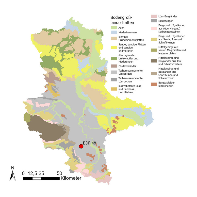 Der Boden unter der BDF 48 ist eine schwach pseudovergleyte Pararendzina aus kiesführendem Kipp-Kalklehm über tiefem kiesführendem Kipp-Kohlekalklehm. Das Substrat wurde als Absetzer-Hochschüttung (1983 bis 1984) gekippt und anschließend planiert. Im Bereich des Oberbodens ist die Trockenrohdichte im hohen Bereich (1,68 Vol.-%), das Gesamtporenvolumen gering (35 Vol.-%) und die nutzbare Feldkapazität mittel (11 bis 16 Vol.-%).
