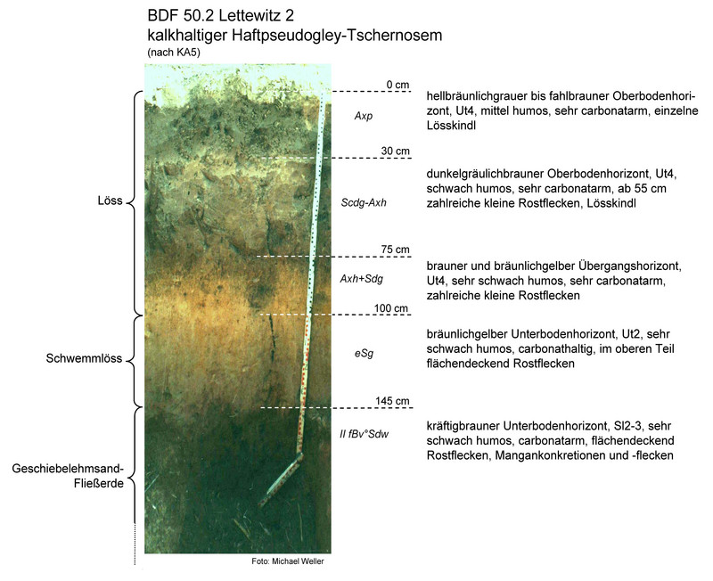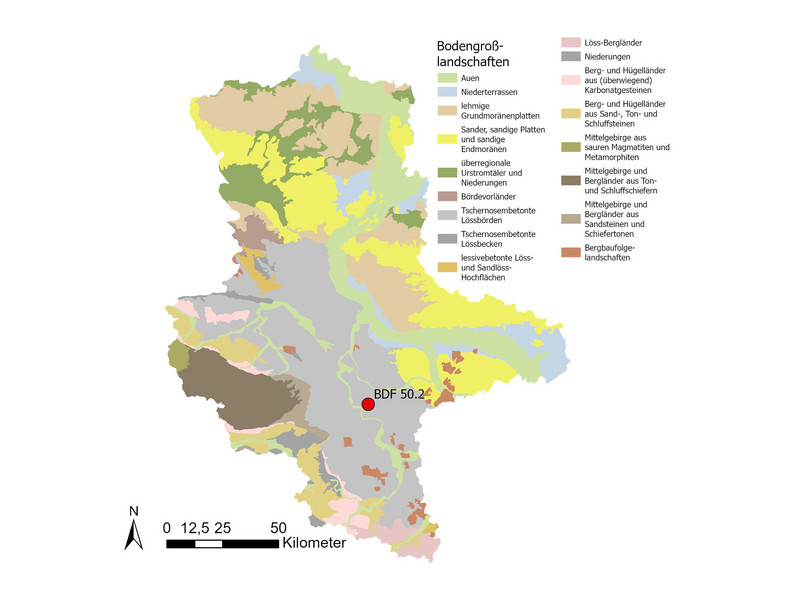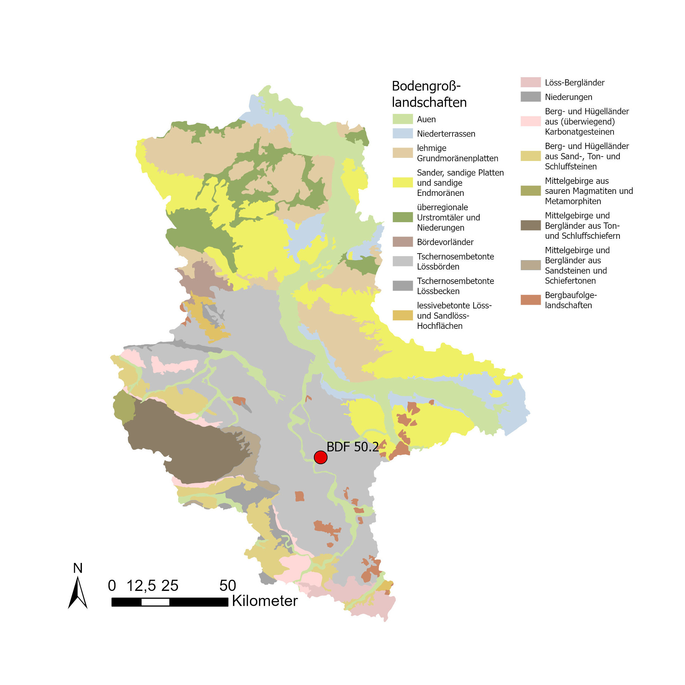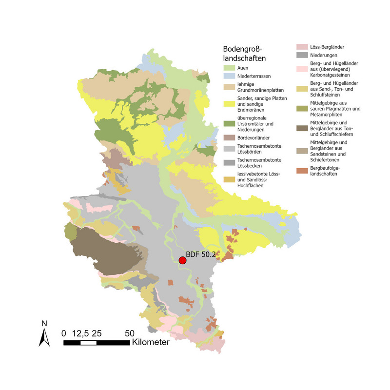 Der Boden unter der BDF 50.2 ist ein kalkhaltiger Haftpseudogley-Tschernosem aus Löss über tiefem Schwemmlöss. Es handelt sich um einen sehr ertragreichen Standort, jedoch kann zeitweise Staunässe die Bearbeitbarkeit und Durchlüftung einschränken. Im Bereich des Oberbodens befinden sich die Trockenrohdichte (1,55 Vol.-%), das Gesamtporenvolumen (39 Vol.-%) und die nutzbare Feldkapazität (13 bis 18 Vol.-%) im mittleren Bereich.