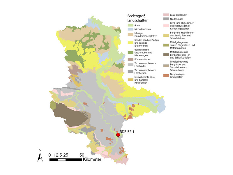 Der Boden unter der BDF 52.1 ist ein pseudovergleyter Normregosol aus kiesführendem Kipp-Lehm über kiesführendem Kipp-Schluff mit Beimengungen von Sand, Ton und Kohle. Das Substrat wurde 1982 als Absetzer-Hochschüttung gekippt und anschließend planiert. Im Bereich des Oberbodens befinden sich die Trockenrohdichte (1,44 Vol.-%), und das Gesamtporenvolumen (45 Vol.-%) im mittleren Bereich und die nutzbare Feldkapazität (8 bis 12 Vol.-%) ist gering.