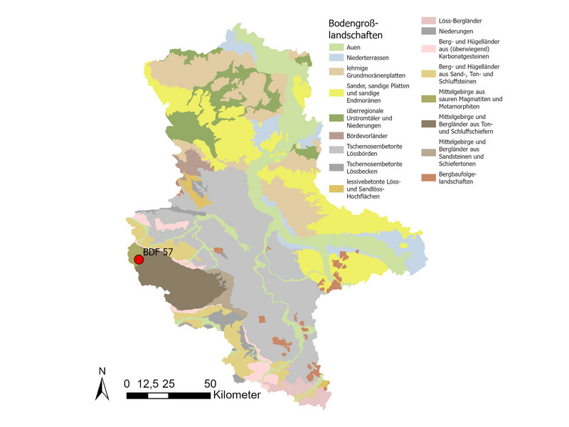 Der Boden unter der BDF 57 ist ein Braunerde-Podsol aus grusführendem Lehm über Grusschluff. Im Bereich des Oberbodens ist die Trockenrohdichte sehr gering (1 Vol.-%), das Gesamtporenvolumen sehr hoch (58 Vol.-%) und die nutzbare Feldkapazität (26 bis 33 Vol.-%) im hohen bis sehr hohen Bereich.