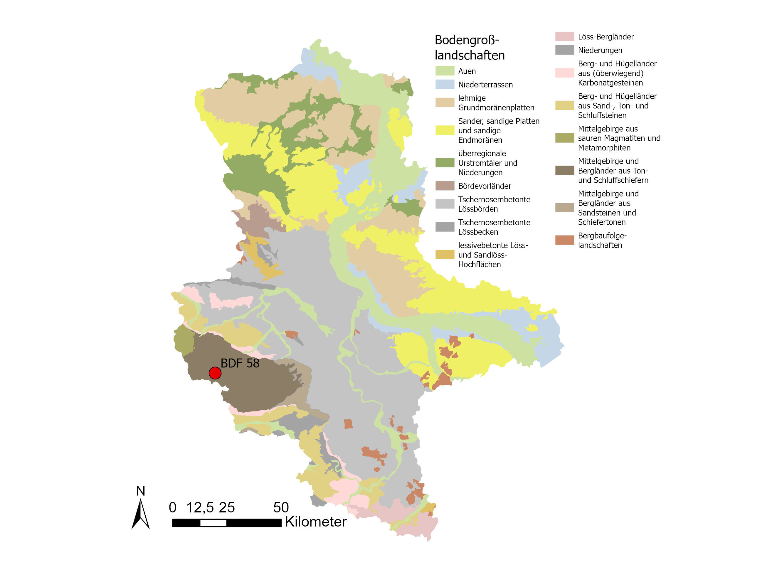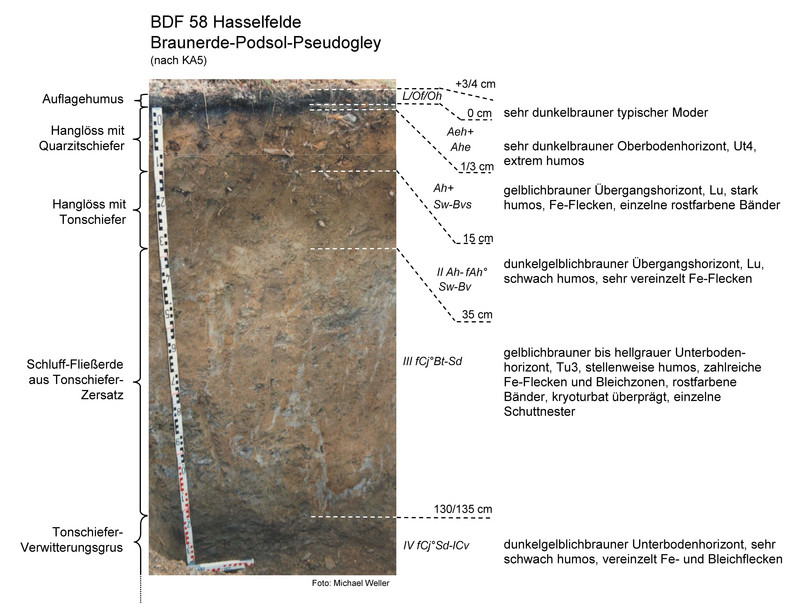 Der Boden unter der BDF 58 ist ein Braunerde-Podsol-Pseudogley aus Hanglöss mit Schiefer über Fließerde aus Tonschiefer-Zersatz. Es handelt sich um einen nährstoffarmen und stauwassergefährdeten Boden mit einer sehr geringen Trockenrohdichte (0,7 Vol.-%), einem sehr hohen Gesamtporenvolumen (67 Vol.-%) und einer hohen nutzbare Feldkapazität (23 bis 27 Vol.-%) im Bereich des Oberbodens.