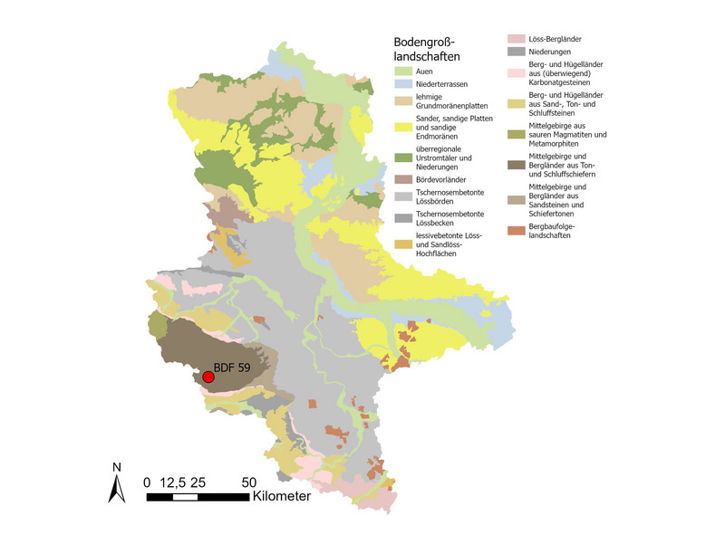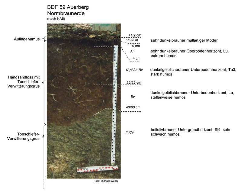 Der Boden unter der BDF 59 ist eine Normbraunerde aus grusführendem Hangsandlöss über Lehmgrus aus Tonschieferverwitterung. Es handelt sich um einen leistungsfähigen Waldboden, welcher ein typischer Standort für Mischwälder oder Buchenwälder ist und auch hier mit Buchen bestockt ist. Im Bereich des Oberbodens ist die Trockenrohdichte sehr gering (0,63 bis 0,85 Vol.-%), das Gesamtporenvolumen sehr hoch (66 bis 71 Vol.-%) und die nutzbaren Feldkapazität mittel bis hoch (19 bis 26 Vol.-%).