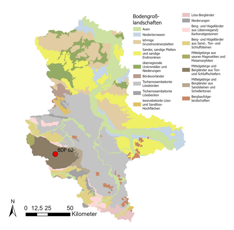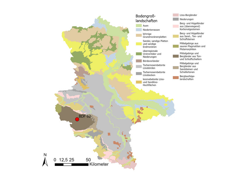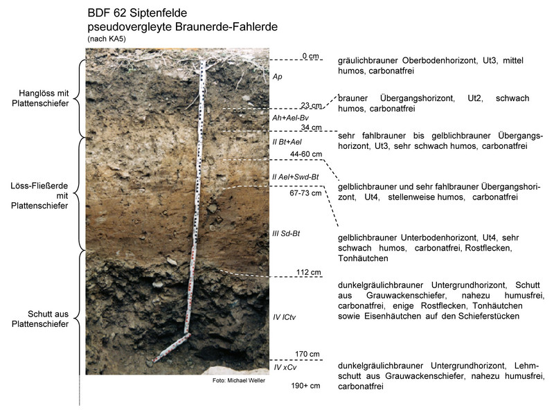 Der Boden unter der BDF 62 ist eine pseudovergleyte Braunerde-Fahlerde aus grus- und schuttführendem Hanglöss über Löss-Fließerde mit Grus und Schutt aus Plattenschiefer. Die Ertragfähigkeit und Bearbeitbarkeit des Standorts kann durch zeitweise Staunässe eingeschränkt sein. Im Bereich des Oberbodens ist die Trockenrohdichte gering (1,3 Vol.-%), das Gesamtporenvolumen hoch (50 Vol.-%) und die nutzbare Feldkapazität ebenfalls hoch (26 bis 29 Vol.-%).