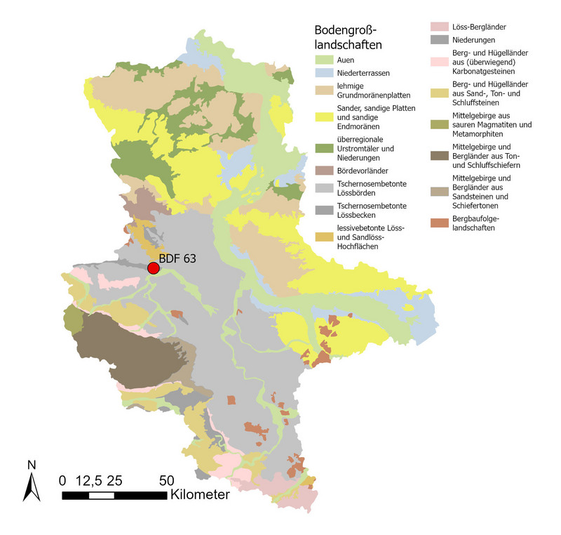 Der Boden unter der BDF 63 ist eine schwach vergleyte Haftpseudogley-Tschernitza aus Auentonschluff über carbonathaltigem Schwemmlöss. Es handelt sich um einen sehr fruchtbaren Ackerstandort, jedoch besteht durch die Lage in der Aue Nässegefahr, welche die Bearbeitbarkeit beeinträchtigen kann. Im Bereich des Oberbodens ist die Trockenrohdichte gering (1,4 Vol.-%), das Gesamtporenvolumen mittel (44 Vol.-%) und die nutzbare Feldkapazität mittel bis hoch (20 bis 27 Vol.-%).