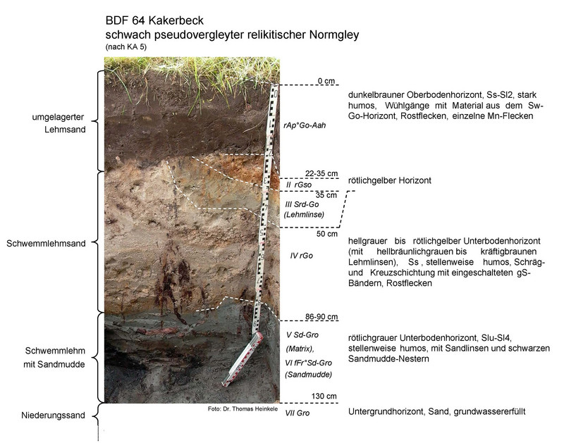 Der Boden unter der BDF 64.2 ist ein schwach pseudovergleyter reliktischer Normgley aus Lehmsand über Schwemmlehmsand und Schwemmlehm. Es handelt sich um einen eher für eine extensive Nutzung geeigneten Grünlandstandort auf Grund der eingeschränkten Befahr- und Bearbeitbarkeit durch den starken Grundwassereinfluss. Im Bereich des Oberbodens liegen die Trockenrohdichte (1,42 Vol.-%), das Gesamtporenvolumen (44 Vol.-%) und die nutzbare Feldkapazität (15 bis 23 Vol.-%) im mittleren Bereich.
