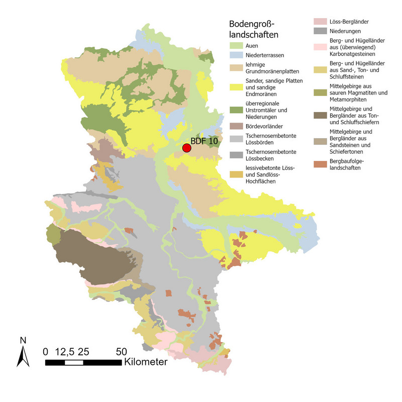 Unter der BDF 10 befindet sich ein reliktischer Normanmoorgley aus fluviatilem Sandlehm über Niederungslehmsand, flach überlagert von Residualmoorlehmsand. Dieser ist durch Entwässerung, einhergehend mit einer Vererdung des Oberbodens, aus einem ehemaligen Niedermoor entstanden. Es handelt sich um einen gut geeigneten Dauergrünlandstandort, die Bewirtschaftung sollte jedoch stets an die zeitweise hohen Grundwasserstände angepasst erfolgen (s. zeitweise eingeschränkte Befahrbarkeit). Die Trockenrohdichte im Oberboden ist sehr gering bis gering (0,8 bis 1,3 Vol.-%), das Gesamtporenvolumen hoch (45 bis 64 Vol.-%) und die nutzbare Feldkapazität sehr hoch (32 bis 44 Vol.-%).