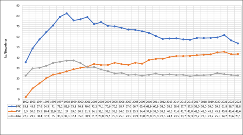 Die Menge der erfassten Wertstoffe ohne Bioabfälle sank im Vergleich zu 2022 um rund 2 Kilogramm pro Einwohner.