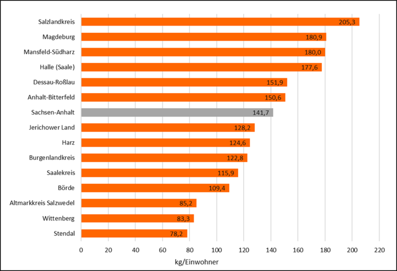 Die durchschnittliche Aufkommensmenge an Hausmüll pro Einwohner für Sachsen-Anhalt lag im Jahr 2023 bei rund 142 kg. Hier gab es große Unterschiede zwischen den einzelnen Entsorgungsgebieten, wie die nachfolgende Abbildung zeigt.