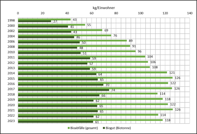 Unter dem Begriff Bioabfälle werden in der Bilanz das über die Biotonnen gesammelte Biogut, Grüngut aus privaten Haushalten sowie Grüngut aus öffentlichen Garten- und Parkanlagen zusammengefasst. Das spezifische Aufkommen an Bioabfällen insgesamt ist nach der erheblichen Abnahme im Jahr 2022 im Jahr 2023 wieder um rund 4 kg/Einwohner angestiegen.