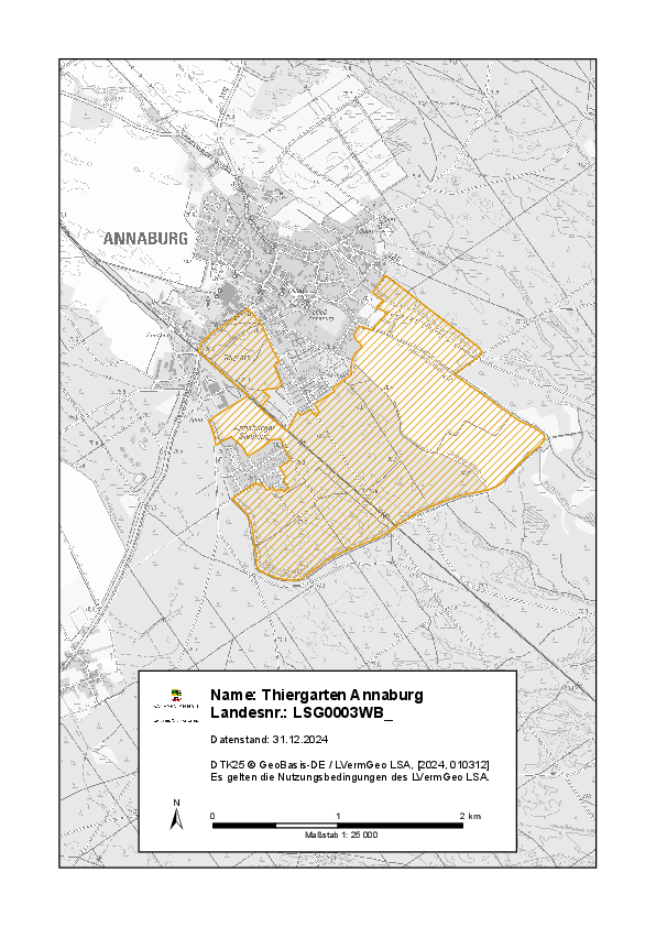 Zur Zeit wird der überwiegende Teil des LSG von großflächigen Waldgebieten eingenommen, sowohl von Laubmischwäldern als auch von Kiefernforsten. Im Norden des Gebietes befindet sich das Renaissanceschloß Annaburg mit seinen Nebengebäuden, dem sich westlich der sogenannte „Kleine Tiergarten“ anschließt, ein alter Laubwaldbestand mit einigen Hügelgräbern. An dem LSG liegen ein Industrie- und Gewerbegebiet und die aus Einfamilienhäusern bestehende „Siedlung Annaburg“, die in den 1930er Jahren entstand. Südlich vom Schloss schließen sich mehrgeschossige Plattenbauten, Kleingartenanlagen und ein Sportplatz an. Der östliche Bereich wird vor allem ackerbaulich genutzt.