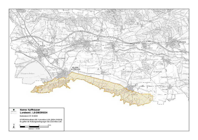 Das LSG „Kyffhäuser“ erfasst nunmehr mit seinem sachsen-anhaltischen Anteil die Nordhänge des Kyffhäusergebirges und die flach zur Goldenen Aue ausstreichenden Buntsandsteinhänge.