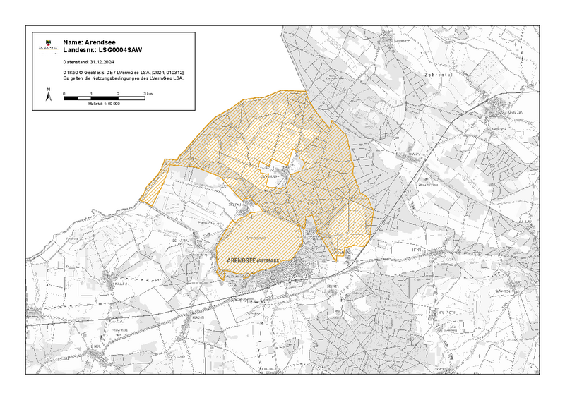 Der rundovale, buchtenlose Arendsee ist fast völlig von Wald umgeben. Er wird oftmals als ”Perle der Altmark” bezeichnet. Lediglich im Südosten grenzen die Bebauung der Stadt Arendsee und am Nordufer Felder und Wiesen bei Zießau an den See. Das Waldgebiet besteht vorwiegend aus forstlich geprägten reinen Kiefernbeständen. Es bildet im Süden und im Westen einen nur 150 bis 200 m breiten Gürtel, wogegen es im Osten und Nordosten weitflächiger ist. Die waldbestandenen Uferpartien im Süden und Westen sind steil ausgeprägt und erreichen mit den Sand-Bergen eine Höhe von 38,9 m über NN, während der Seespiegel bei 23 m über NN liegt. Am Hangfuß verläuft bei Arendsee die mit Linden und Eichen bestandene Uferpromenade, ein anschließender schmaler Uferstreifen ist mit Laubgehölzen bestanden. Er verbreitert sich westlich der Ortslage Arendsee und ist parkartig gestaltet. Das Nordufer des Sees ist flach. Kleine Ackerflächen und die sogenannte ”Försterwiese” als Grünland sind dort in das LSG einbezogen. Der am See vorhandene Schilfgürtel ist durch den Bau zahlreicher Bootsstege und durch die Schaffung von Zufahrten ebenso beeinträchtigt wie der Gehölzbestand an der Wochenendsiedlung und dem ehemaligen Zeltplatz.