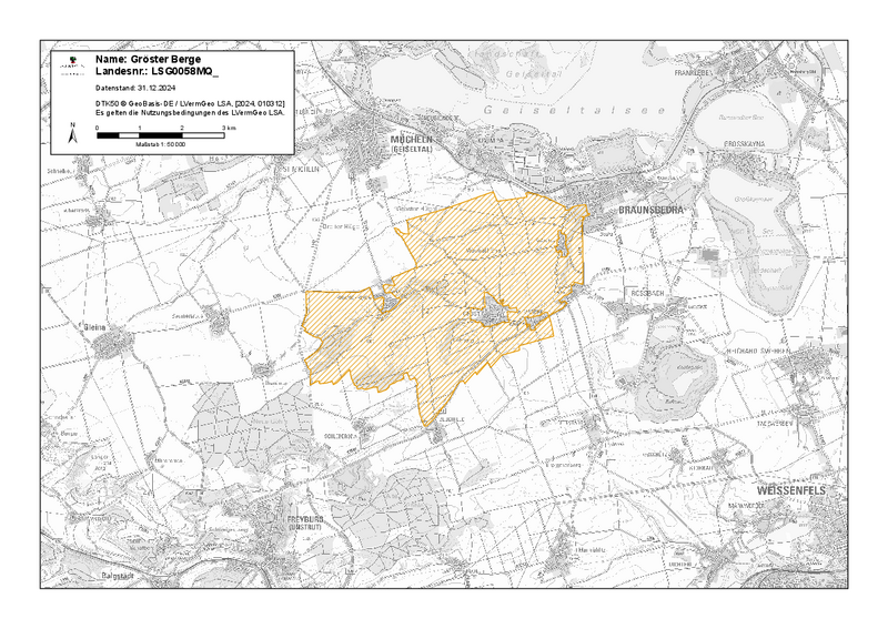 Als „Gröster Berge“ wird eine Hügelkette südlich und östlich der Leihaniederung bezeichnet. Der Kuhberg bei Gröst ist die markanteste Erhebung dieser Reihe. Er erhebt sich mit einer maximalen Höhe von 176,5 m über NN zirka 40-45 m über die Niederung. Das LSG wird westlich und südlich von der Kreisgrenze zum Burgenlandkreis begrenzt. Im Osten erstreckt es sich bis zum Ortsrand Braunsbedra und im Norden bis nach Krumpa. Die Ost-West-Ausdehnung beträgt zirka 7 km, die Nord-Süd-Ausdehnung etwa 5 km. Nach der naturräumlichen Gliederung liegt das LSG im südlichen Teil der Landschaftseinheit Querfurter Platte.