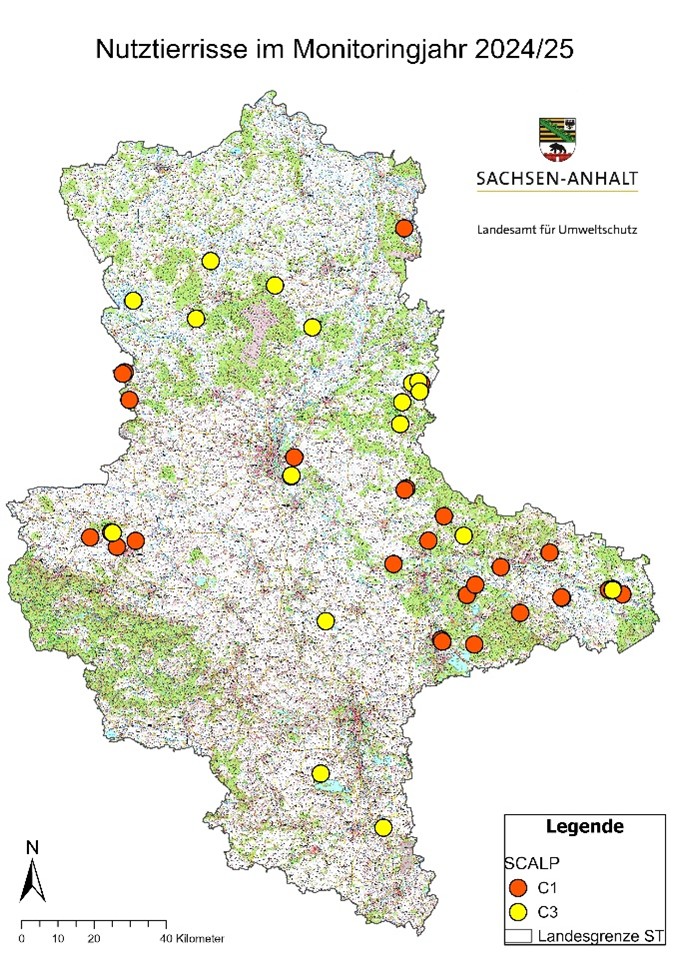 Auch im besprochenen Monitoringjahr sind die Übergriffe auf Nutztiere wiederum in der Fläche weiter verteilt und lokal nicht so stark konzentriert wie in früheren Monitoringjahren. Wie schon in Abbildung 4 wird auch in Abbildung 5 deutlich, dass viele Übergriffe im Landkreis Wittenberg stattgefunden haben. Außerdem gab es einige Übergriffe im Bereich des Huy und zwei im Süden von Sachsen-Anhalt.