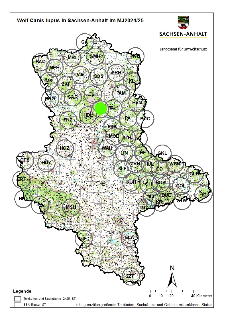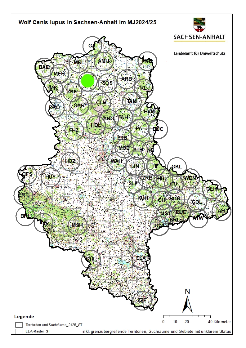Aufgrund von Hin- und Nachweisen wurden auch in diesem Jahr insgesamt sieben Suchräume eingerichtet, in denen landschaftlich bedingt Wölfe territorial siedeln könnten. Dabei handelt es sich um zwei schon länger beobachtete Gebiete (Osterwieck-Fallstein und Mansfeld-Südharz) und fünf neu eingerichtete Suchräume (Tangermünde, Lindau, Ziegelrodaer Forst, Elster-Luppe-Aue und Zeitzer Forst). Meist liegen bereits Hinweise oder auch vereinzelte Nachweise aus solchen Regionen vor, denen mit dem aktiven Monitoring durch das WZI nachgegangen wird. In den hier genannten Gebieten reichten die Informationen jedoch nicht aus, um neue Territorien auszuweisen. Sie sollen dennoch hier kartografisch dargestellt werden.